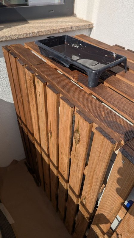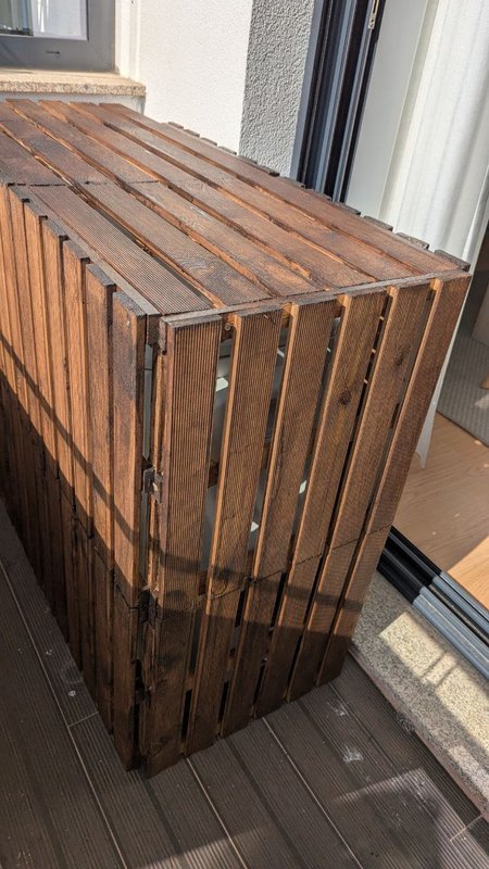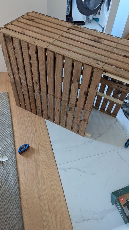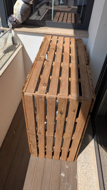 Comecei por montar a estrutura de madeira, garantindo que as dimensões eram perfeitas para envolver o equipamento. Após a montagem inicial, apliquei um tratamento protetor à madeira, que não só realça a sua beleza natural, mas também a protege contra as intempéries, essencial para um elemento exterior.