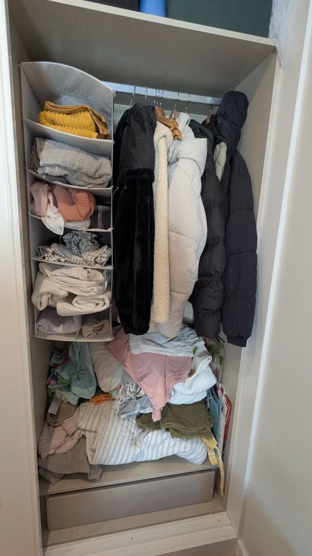 O resultado é visível: um roupeiro muito mais organizado, com espaço dedicado para peças dobradas e para pendurar. Esta intervenção simples fez uma enorme diferença na funcionalidade do quarto e na facilidade de manter tudo em ordem. Se procura soluções semelhantes para a sua casa no Porto ou Gaia, eu posso ajudar a transformar os seus espaços!