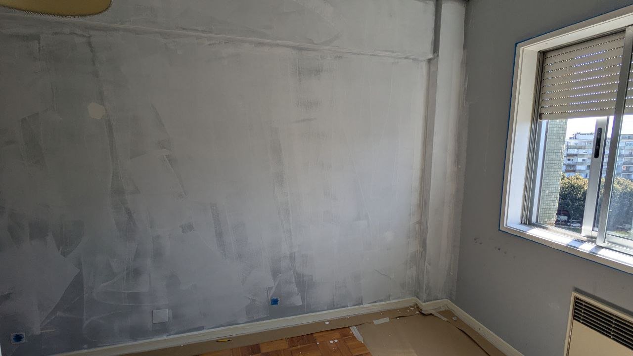 A primeira etapa foi a preparação das paredes. Tapei todos os furos e imperfeições, deixando as superfícies prontas para a pintura. A escolha das cores ficou ao meu critério, optando por tons neutros e modernos que valorizam o espaço.