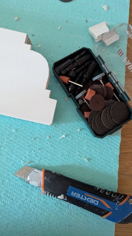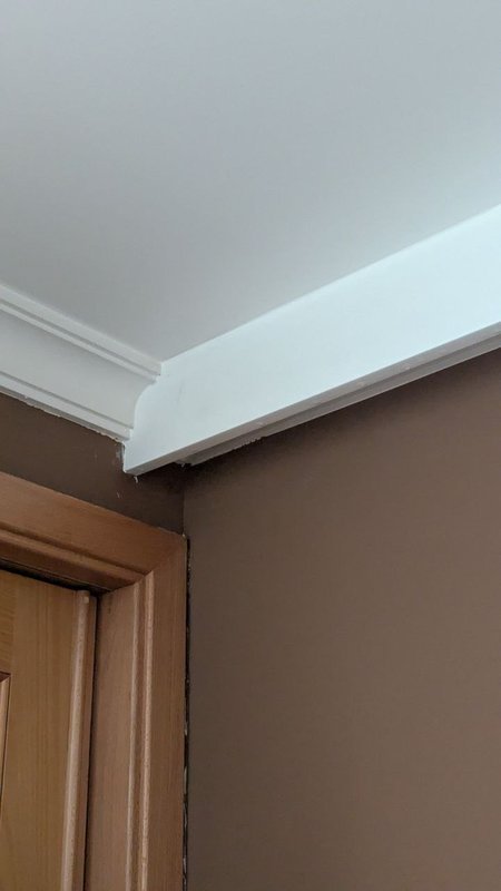 Cortei cuidadosamente os orifícios para os interruptores, preparando a parede para a funcionalidade desejada. Em seguida, instalei uma fita LED com um rodapé decorativo no teto, adaptando o padrão do rodapé existente para uma integração perfeita.