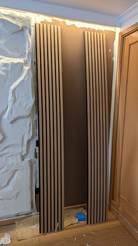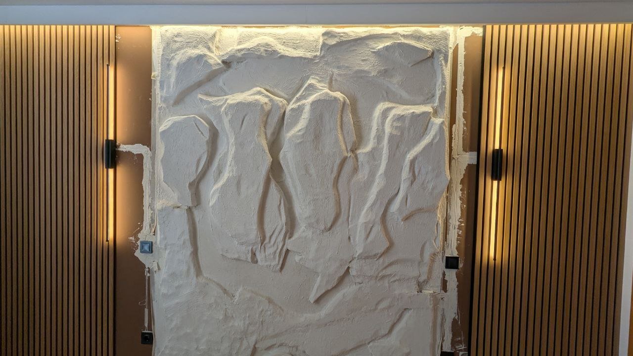 Para finalizar, revesti a parede com painéis decorativos, realizando os cortes precisos para as tomadas e interruptores. No centro, o cliente irá criar uma imitação de parede de pedra, complementando o design que eu ajudei a concretizar. Este trabalho demonstra a minha dedicação a soluções elétricas e decorativas personalizadas no Porto e Gaia.