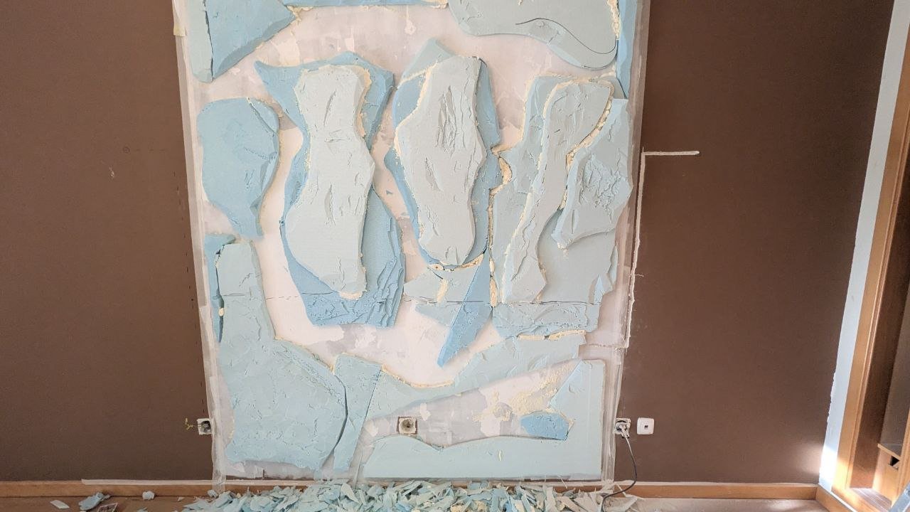A parede onde o espaldar seria montado era revestida a pladur (gesso cartonado). Para garantir a máxima segurança e estabilidade, sabia que não podia fixar diretamente no pladur. Por isso, abri cuidadosamente as cavidades necessárias para aceder à parede de betão subjacente.