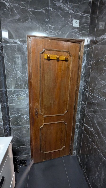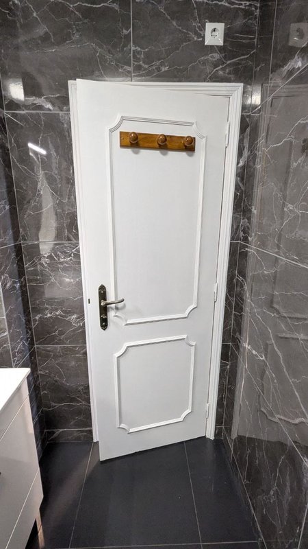 Para a casa de banho, o cliente desejava uma transformação completa. Eu repintei a porta de madeira escura para um branco imaculado. O resultado? Uma diferença notável que iluminou todo o espaço, conferindo-lhe uma sensação de maior amplitude e modernidade.