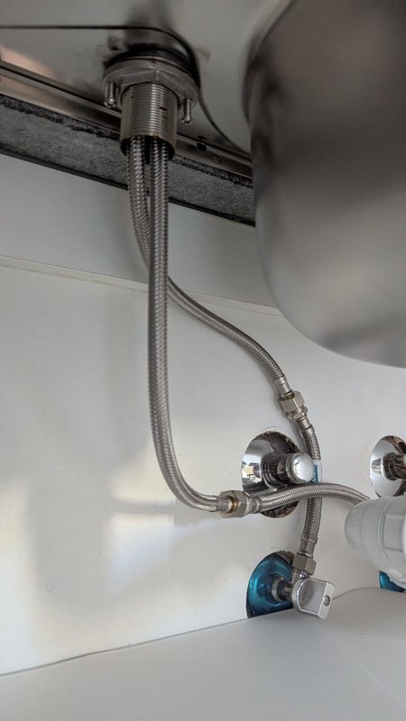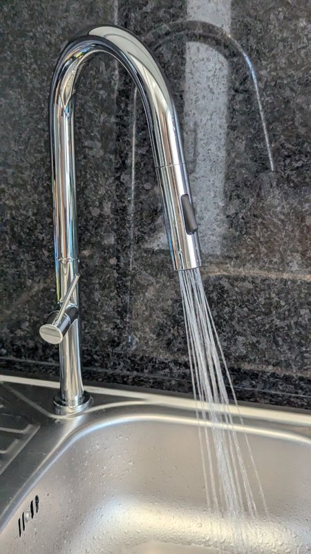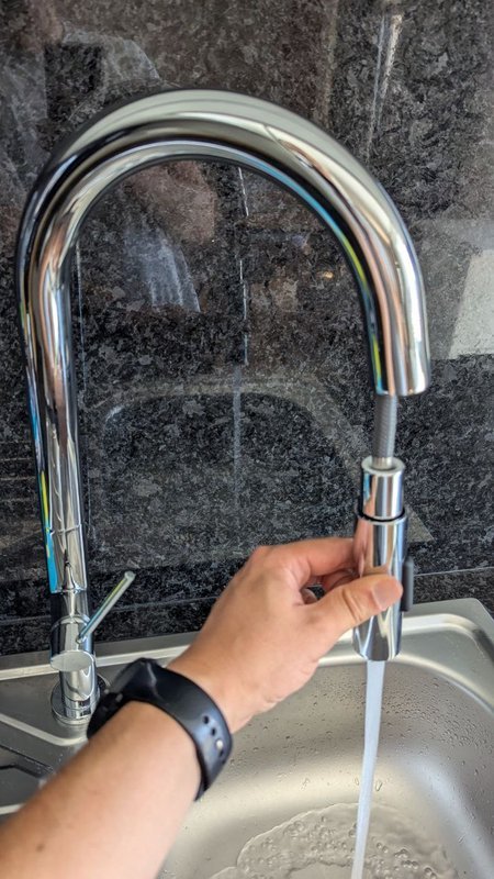 A minha tarefa foi remover a torneira existente e instalar uma nova, muito mais versátil. Optei por uma torneira de cozinha com bico extensível e modo chuveiro